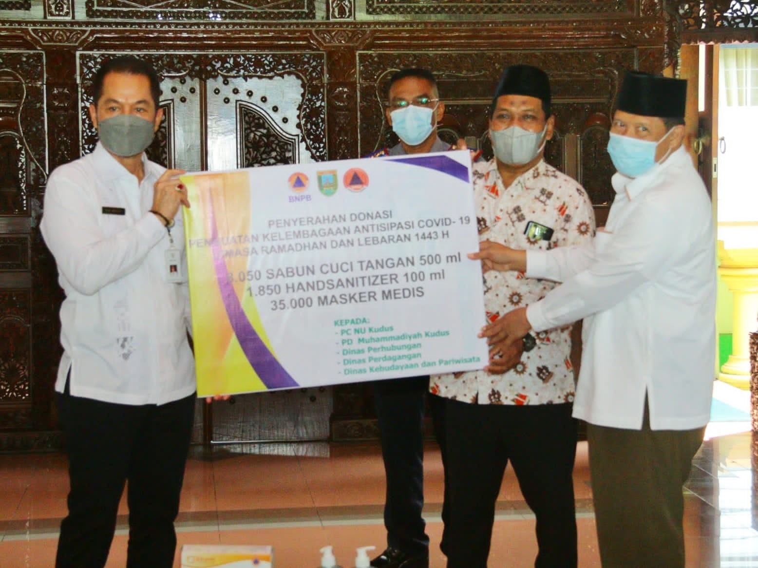 Dalam upaya mendukung penerapan protokol kesehatan di masyarakat menjelang hingga pasca perayaan Hari Raya Idulfitri 1443 H, Badan Nasional Penanggulangan Bencana (BNPB) menyerahkan bantuan penunjang protokol kesehatan seperti masker, sabun cuci tangan, dan hand sanitizer kepada Pemkab Kudus melalui BPBD Kudus.