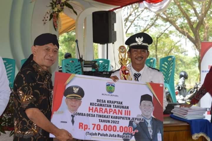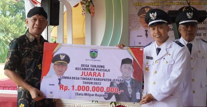 Bupati Jepara Dian Kristiandi menyerahkan hadiah kepada pemenang lomba desa tahun 2022. Penyerahan dilakukan dalam kegiatan Pencanangan Bulan Bhakti Gotong Royong Masyarakat (BBGRM) di Obyek Wisata Pandan Arum Desa Suwawal Timur Kecamatan Pakisaji, Rabu (18/5/2022).