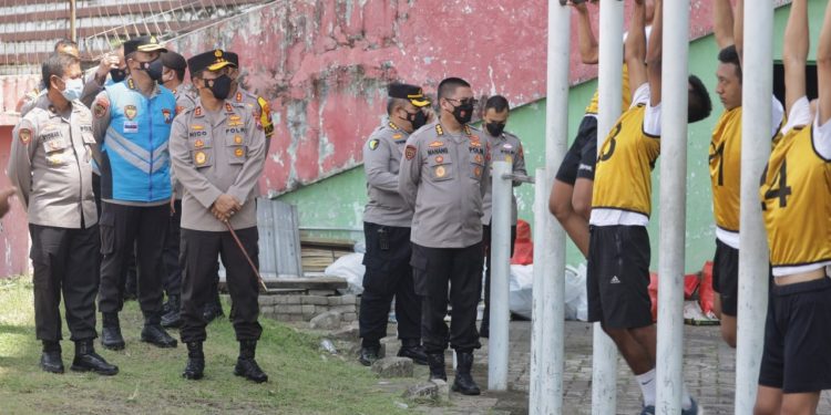 Kapolda Jawa Timur Irjen Pol Nico Afinta, bersama Brigjend Pol. Nyoman Lastika (Analis Kebijakan Biro Psikologi SSDM Polri selaku Tim Assistensi Penerimaan Polri Terpadu Panda Jatim) didampingi Karo SDM Polda Jatim Kombes Pol Harry Kurniawan dan Pejabat Utama Polda Jatim, Rabu (25/5/2022) siang, melalukan pengecekan test kesamaptaan jasmani seleksi penerimaan Bintara Polri gelombang II T.A 2022 Panda Jatim, di GOR Delta Sidoarjo.