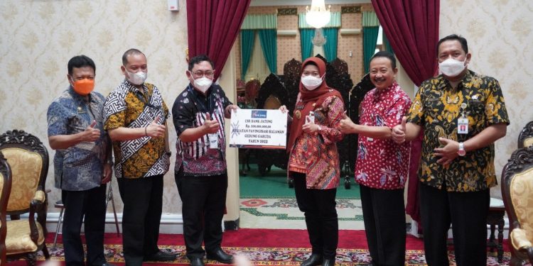 Bank Jateng kantor cabang Demak menyerahkan secara simbolis bantuan dana corporate social responsibility (CSR) kepada Bupati Demak Eisti’anah, Kamis, (23/6/22) di ruang transit Bupati.