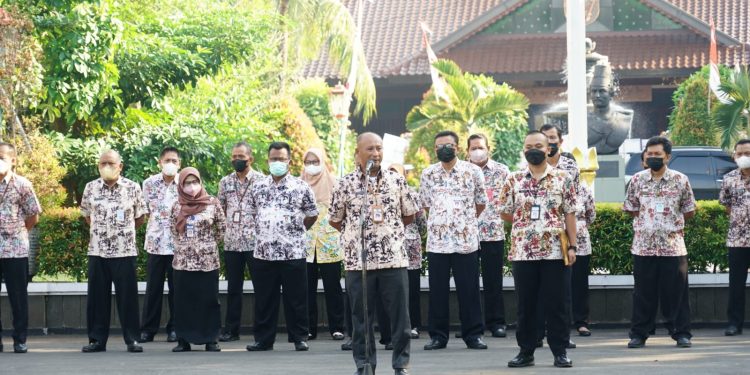 Pj Bupati Pati Henggar Budi Anggoro memimpin apel pagi di lingkungan Setda Kabupaten Pati Kamis (25/8) di halaman Setda Pati.