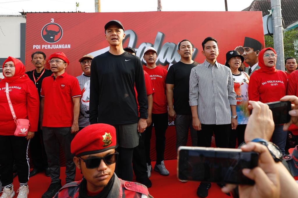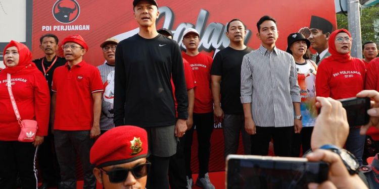 Putra sulung Presiden Joko Widodo, Gibran Rakabuming Raka kembali mendampingi Ganjar Pranowo menyapa masyarakat. Usai ikut blusukan Ganjar ke Bogor kemarin, hari ini Minggu (23/7/2023) Wali Kota Solo itu mendampingi bacapres 2024 dari PDIP jalan sehat di Solo.