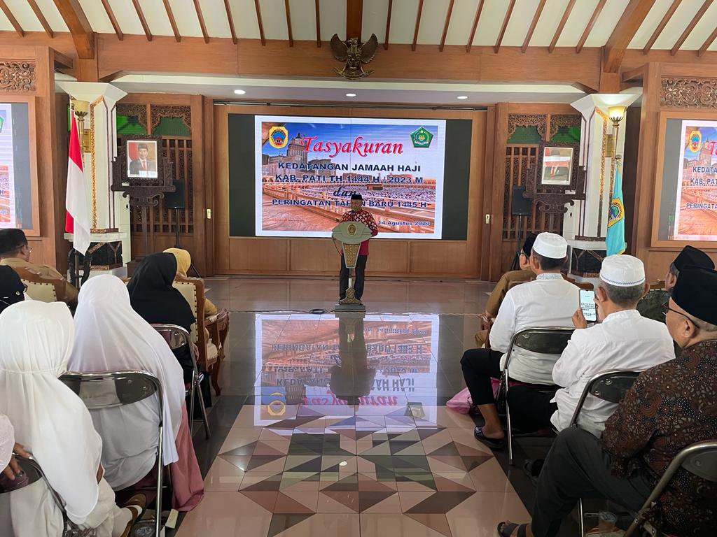 Sekitar 1.600 orang jamaah haji Kabupaten Pati mengikuti kegiatan pengajian Tasyakuran Kedatangan Jamaah Haji tahun 2023 dan Peringatan Tahun Baru 1445 hijriyah di Pendopo Kabupaten Pati, Senin (14/8).