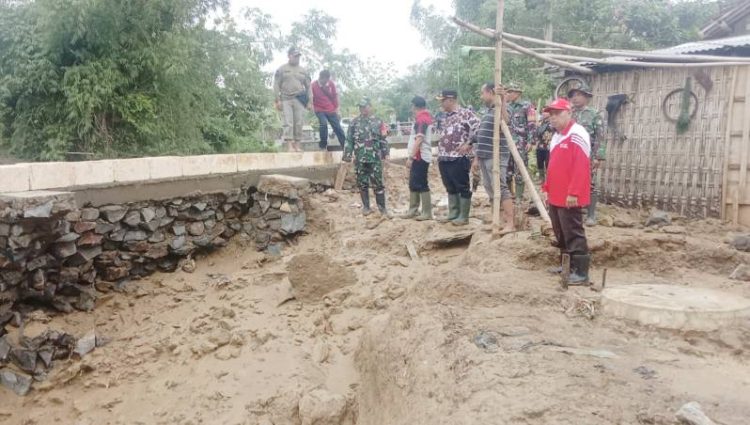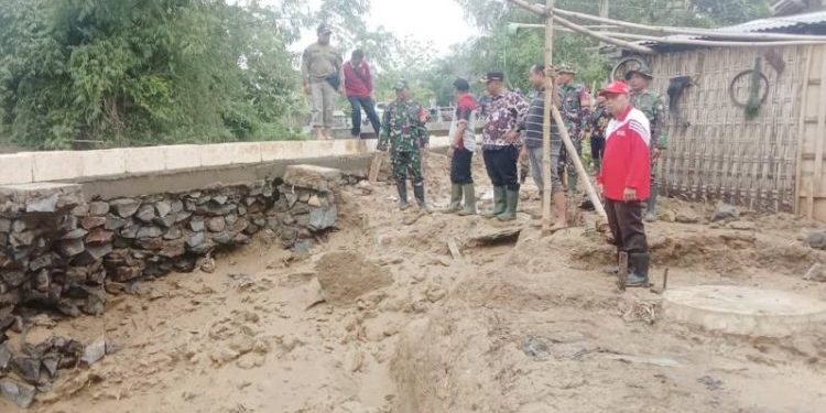 PLH. Danramil 20/Tambakromo Kodim 0718/Pati Letda Cba Adi Agung Prakoso mendampingi Pj Bupati Pati Henggar Budi Anggoro meninjau langsung lokasi tanggul sungai yang jebol di desa Angkatan kidul dan Angkatan lor Kecamatan Tambakromo Kabupaten Pati, Selasa (28/11/2023).