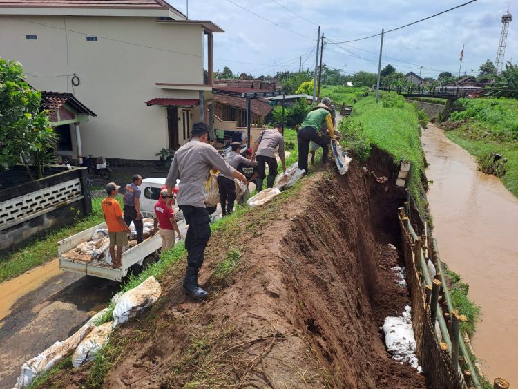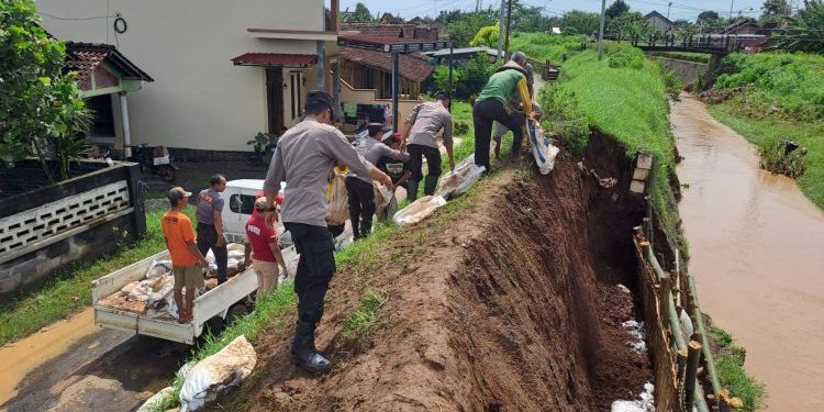 Polisi Bersama Warga Sigap Perbaiki Tanggul yang Jebol di Margoyoso
