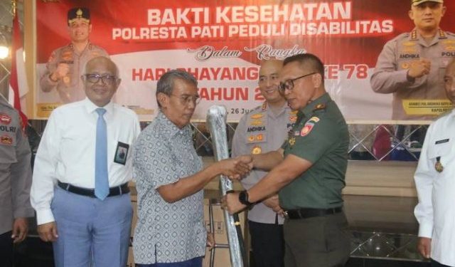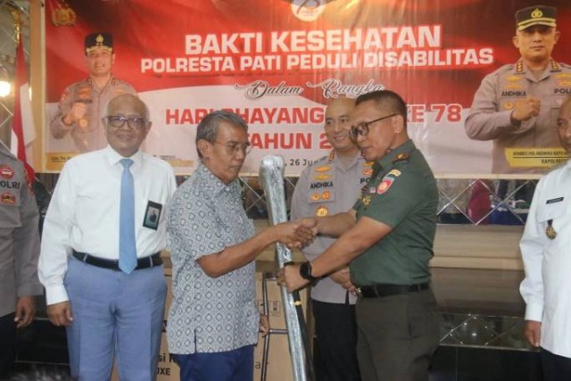 Dalam rangkaian acara tersebut, dilakukan penyerahan bantuan secara simbolis kepada para penyandang disabilitas. Kapolresta Pati menyerahkan kursi roda, sementara PJ Bupati Pati dan Dandim 0718/Pati menyerahkan krek (alat bantu jalan). Selain itu, Direktur Rumah Sakit KSH Pati dan Ketua Bhayangkari Cabang Polresta Pati menyerahkan alat bantu dengar.