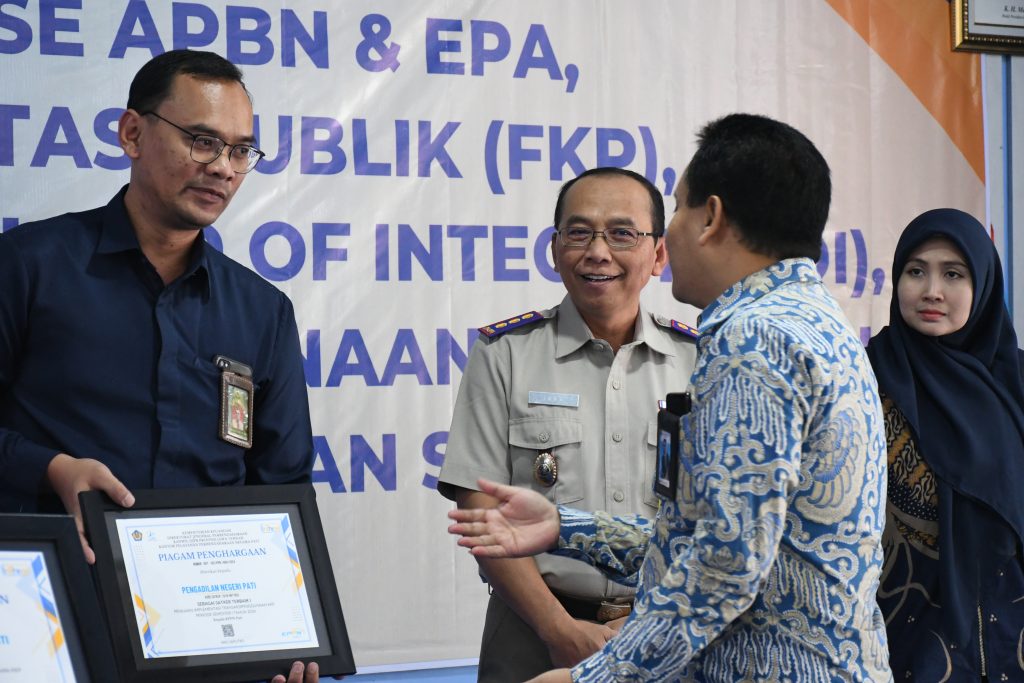 Pengadilan Negeri Pati Kelas IA torehkan prestasi dalam bidang pengelolaan anggaran. Bertempat di Aula KPPN Pati, dilakukan kegiatan penyerahan penghargaan sebagai Satker Terbaik I penilaian Implementasi Transaksi Penggunaan KKP periode Semester I Tahun 2024, Satker Terbaik I Penilaian Indikator Kinerja IKPA Kategori Sedang Periode Semester I Tahun 2024, Satker terbaik III Penilaian Implementasi Transaksi Penggunaan Digipay Periode Semester I Tahun 2024. Selasa (23/07/2024)