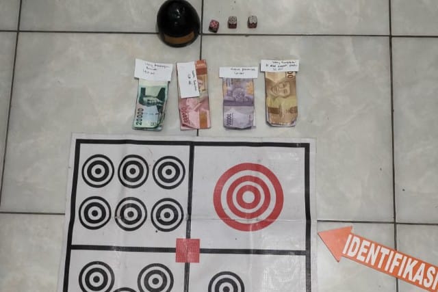 Kapolsek menuturkan barang bukti yang diamankan berupa tempurung/batok kelapa yang telah dicat warna hitam, perlak dengan gambar mata dadu yang digunakan sebagai tempat pasang taruhan, mata dadu dan Uang tunai sejumlah Rp. 735 Ribu.