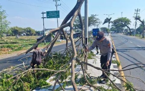 Polsek Pati Polresta Pati bekerja sama dengan Badan Penanggulangan Bencana Daerah (BPBD) Kabupaten Pati dan Tim Relawan Banser (BARETA) turun tangan untuk mengevakuasi pohon tumbang yang menghalangi jalur di Jalan Lingkar Selatan (JLS) Pati, tepatnya di Desa Mustokoharjo, Kecamatan Pati, Kabupaten Pati.
