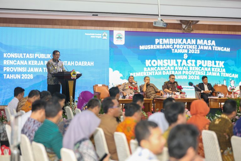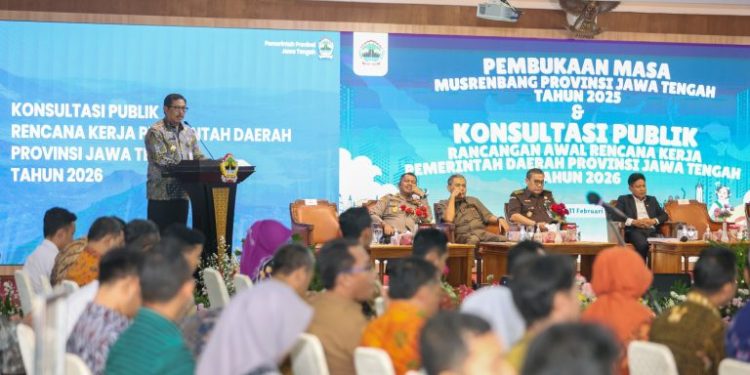 Penjabat (Pj) Gubernur Jawa Tengah Nana Sudjana, membuka Musyawarah Rencana Pembangunan (Musrenbang) dan konsultasi publik Rencana Kerja Pemerintah Daerah (RKPD) 2026, Selasa (11/2/2025). Ia menegaskan, Jawa Tengah mantap menuju visi sebagai penumpu pangan nasional dan indusri nasional, serta mengimplementasikan program Asta Cita.