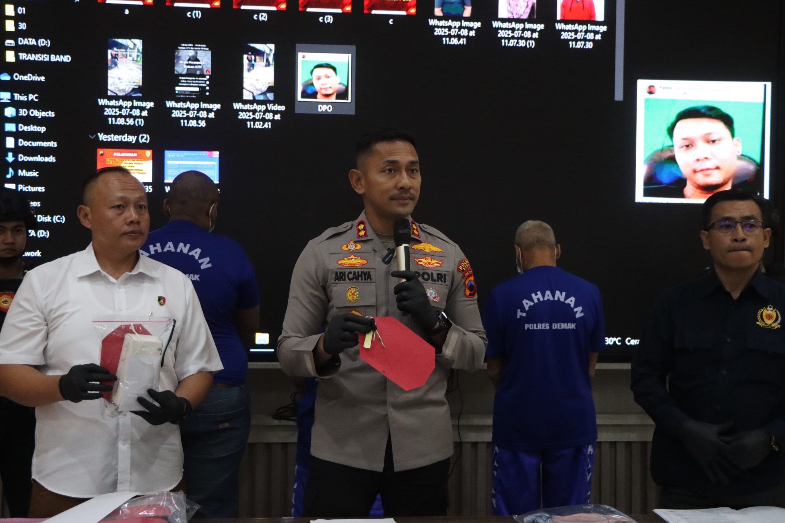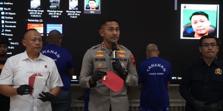 Kapolres Demak, AKBP Ari Cahya Nugraha saat konferensi pers di Mapolres Demak, Rabu (9/7/2025), menjelaskan bahwa pelaku berinisial DK (46), warga Kecamatan Mranggen, berhasil diamankan oleh Satreskrim Polres Demak bekerja sama dengan Satreskrim Polrestabes Semarang. Sementara dua pelaku lain berinisial MF dan SO masih dalam pengejaran.