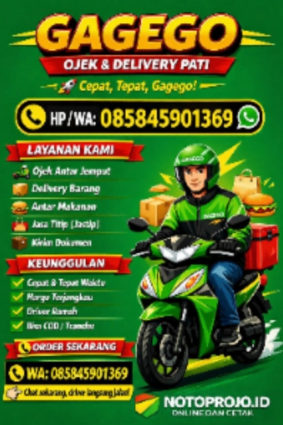 Layanan transportasi dan pengiriman berbasis lokal, GAGEGO, resmi hadir di Kabupaten Pati dengan menawarkan berbagai kemudahan bagi masyarakat dalam memenuhi kebutuhan mobilitas dan distribusi barang secara cepat, tepat, dan terjangkau.