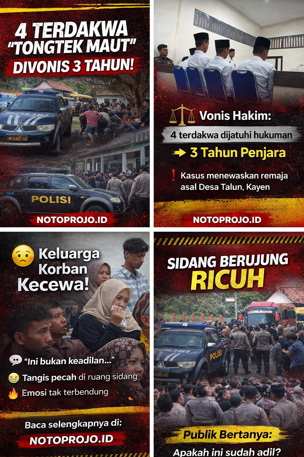 Suasana sidang di Pengadilan Negeri Pati mendadak berubah tegang pada Senin (20/4/2026). Vonis tiga tahun penjara yang dijatuhkan majelis hakim kepada empat terdakwa kasus “tongtek maut” langsung memantik ledakan emosi dari keluarga korban dan warga yang memadati ruang sidang hingga halaman pengadilan.